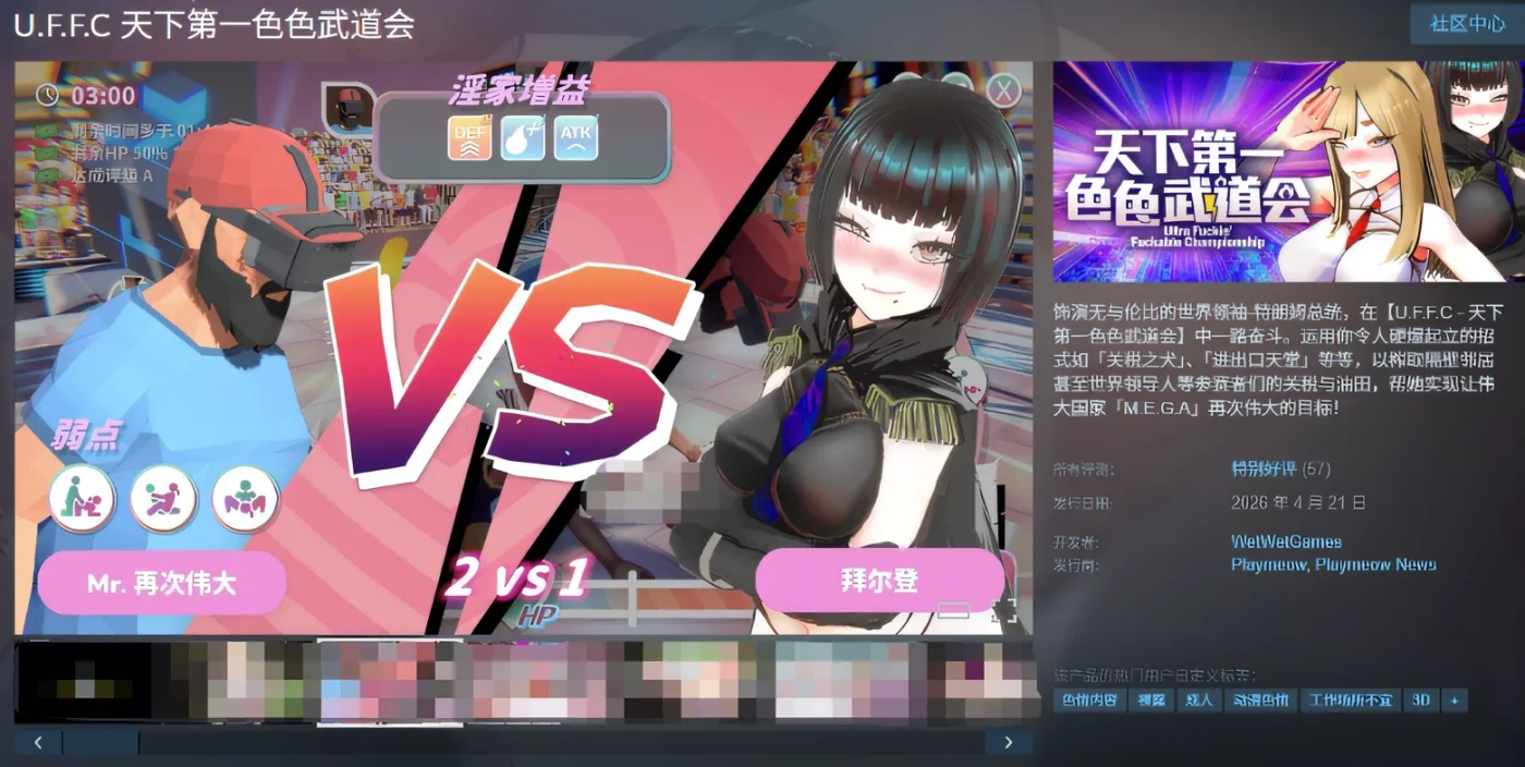 ![]() 游戏介绍饰演无与伦比的世界领袖-特朗姆总统,在【U.F.F.C – 天下第一色色武道会】中一路奋斗。运用你令人硬爆起立的招式如「关税之犬」、「进出口天堂」等等,以榨取隔壁邻居甚至世界领导人等参赛者们的关税与油田,帮她实现让伟大国家「M.E.G.A」再次伟大的目标! ◆ 剧情梗概准备好投身于本年度最为狂放不羁、尺度大开且荒诞绝伦的盛事——天下第一瑟瑟武道会!这场以3D形式呈现的瑟技格斗大赛,巧妙融合了令人忍俊不禁的黑色幽默与让人血脉贲张的极限瑟情对抗,必将带来只能用单手操作的极致游玩体验。你将化身那位傲慢而强横的特朗姆总统,运用一系列使人难以招架的独门瑟技,诸如震撼全场的“税务打桩机”与令人目眩的“进出口天堂”狂野招式,从你的邻邦乃至全球领袖等参赛者身上,竭力榨取关税与油田资源。在这场高潮迭起、激情四射的冒险旅程中,你将亲历特朗姆从本土赛事一路征战至世界级联赛的种种离奇与香艳场面,并以她臻于化境的瑟潮技巧征服所有对手。每一次酣畅淋漓的胜利,都将为你赢得丰厚的关税回报,用以解锁特朗姆阁下更多令人惊叹的能力,巩固她在赛场的至尊地位!你是否能辅助特朗姆总统问鼎世界,实现让“伟大国度”再度辉煌的宏愿?自由世界的未来系于一线,唯有你能决定最终的王者!现在,就请在这款独一无二的游戏中尽情欢笑、惊呼、振奋,立志成为天下第一瑟瑟武道会的“湿系宗师”吧!比赛,正式开始! ◆ 核心玩法在U.F.F.C的竞技舞台上,你将迎战来自各界的形形色色对手,从街头浪人到国家元首,无所不包。每位挑战者都拥有独具特色的性格与能力,确保每一次“深入交流”都能带来崭新的瑟涩体验。通过不断晋级更高级别的联赛,你将解锁新的挑战;亦可积累“关税”资源,持续夯实特朗姆作为终极冠军的统治根基。精研各式独特的姿态、主技能与衍生技能,争取获得最高SSS评级,从而提升你的积分与关税收益。每场对决结束后,你可以选择实施【ICE清除行动】,驱逐帝国内部的非法怪物以获取额外资金;或是通过【学习】私密技巧来提升瑟涩表现;亦可在【画廊】中回味珍藏时刻,逐步揭开隐藏的故事线,最终解锁神秘的特殊角色。 ◆ 特色内容◇ 令人热血沸腾的动画CG与剧情过场 ◇ 超过20位设计独特的对手角色 ◇ 沉浸式的对话系统,富含幽默的政治讽刺与成人议题 ◇ 多个充满诙谐与讽刺意味的游戏结局 ◇ 紧张刺激的生存挑战模式【ICE清除行动】 ◇ 新增NewGame+模式,包含可操作角色及隐藏剧情等额外可解锁奖励 游戏截图![]() ![]() ![]() ![]() 下载链接欢迎光临~ 哎呀,您还不是大会员呢 要给我『3 天空石』才能解锁链接哦 二次元资源尽在AcgFun! |